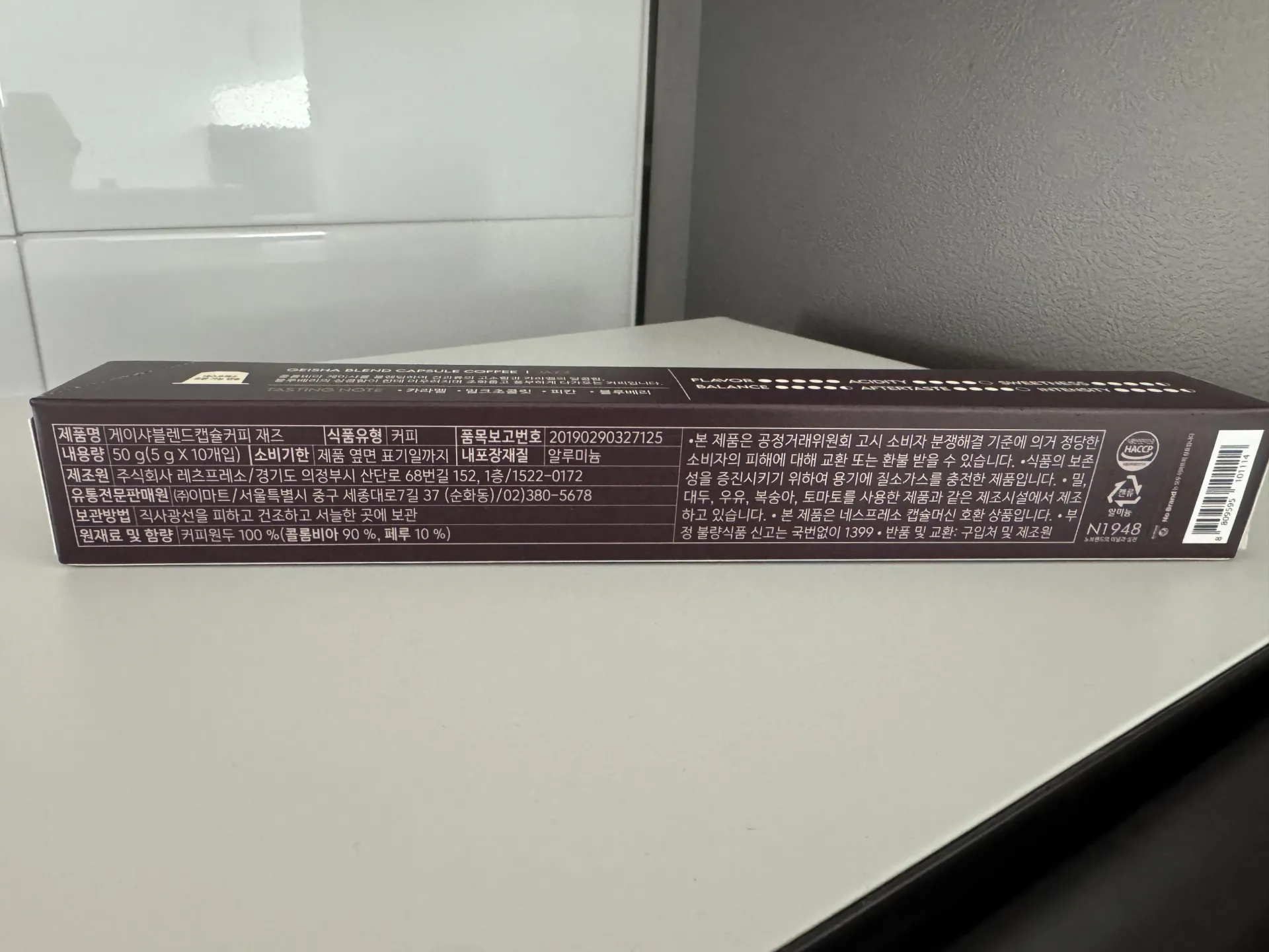 노브랜드 게이샤블렌드캡슐커피 제품은 길쭉한 형태의 종이상자에 포장되어 있었고, 해당 상자에는 제품 정보들이 상세히 기재되어 있었다.