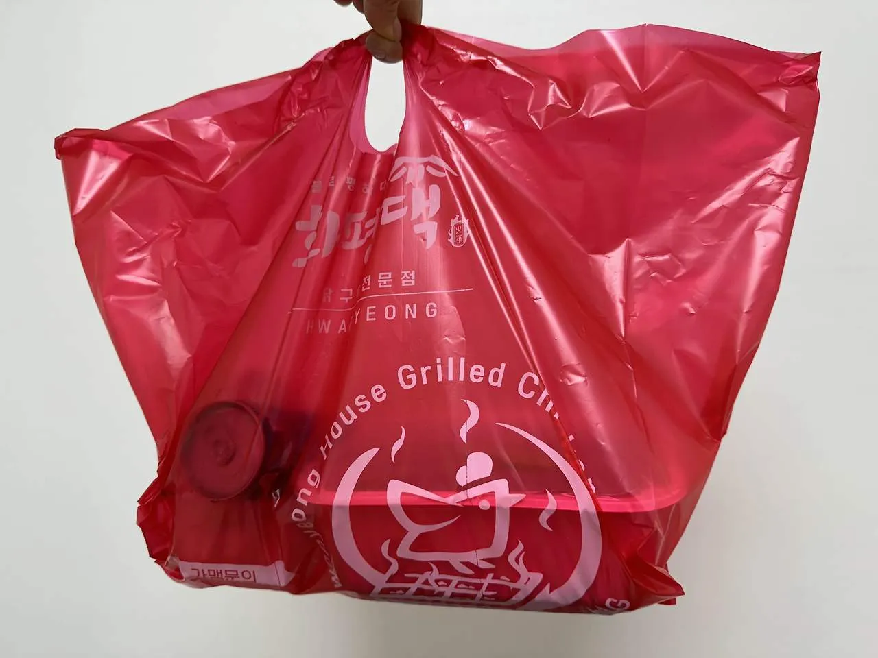 주문한 음식은 약 10-15분 정도 소요되어 준비되었으며, 음식은 화평댁 로고가 새겨진 빨간 봉투에 포장되어 있었다.