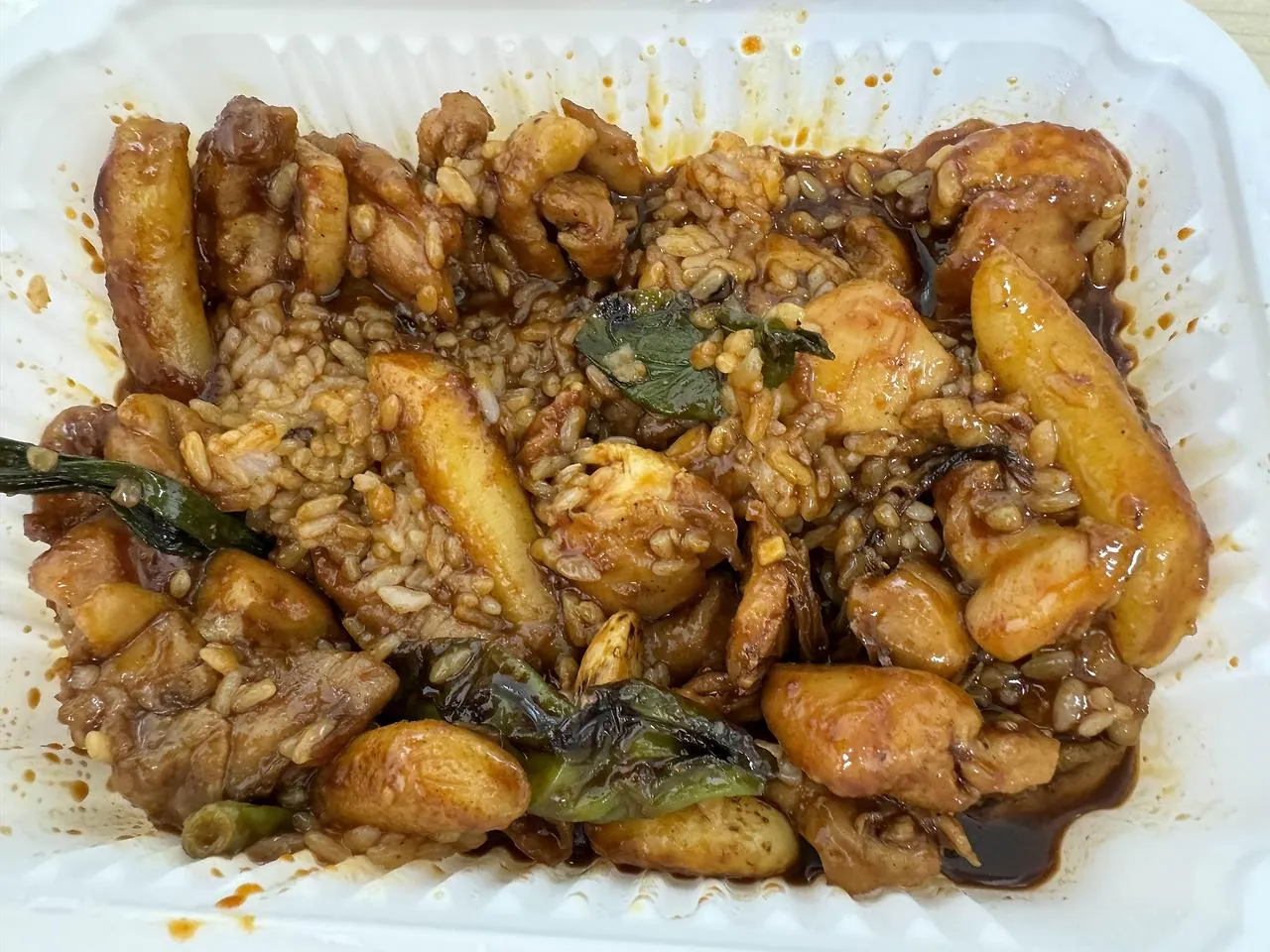 화평댁닭구이의 직화한마리 양념닭구이의 내용물은 다리살 순살, 쌀떡, 대파, 마늘 등으로 구성되어 있었고, 모든 내용물들은 상당히 신선한 상태였다.