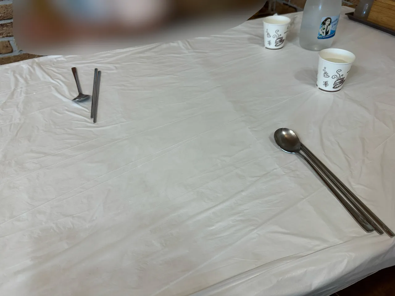우리는 테이블형 좌석에 자리를 잡았고, 테이블 위에는 일회용 식탁보, 수저, 휴지, 후추 등이 세팅되어 있었다.
