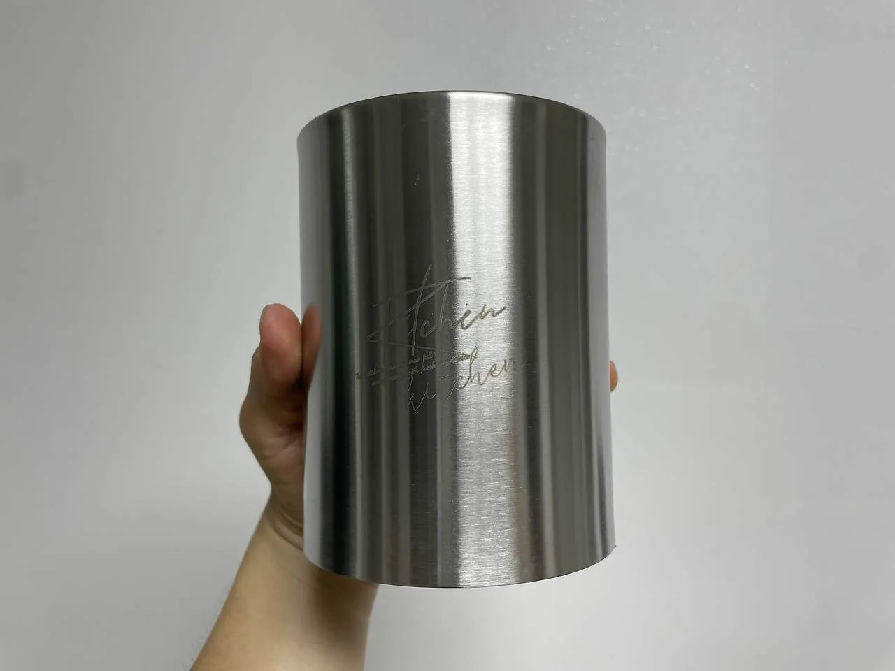제품은 스테인레스 소재만으로 이루어져 있었으며, 겉면에는 Kitchen이라는 문구가 필기체 형태로 새겨져 있었다.